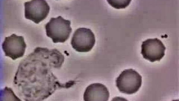 Tak nasz uklad immunologiczny walczy z bakteria. To duze "cos" to odmiana bialej krwinki, a to male uciekajace to bakteria. Zobaczcie kto wygra ^^