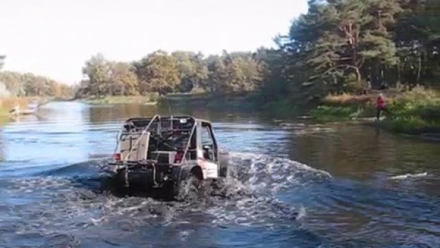 Przeprawa samochodem terenowym przez rzeke.