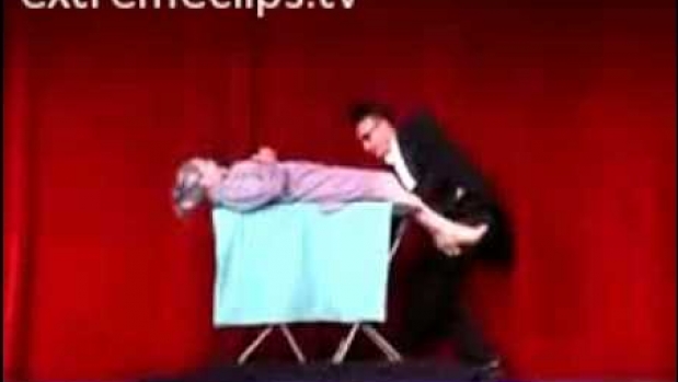 Raczej powinien się zatrudnić w jakimś kabarecie, zamiast narażać swoją asystentkę na trwałe kalectwo