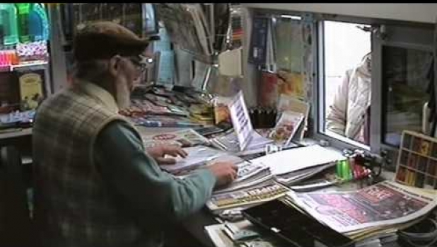 Jerzy Kryszak przebrany aby go nie rozpoznano, wciela się w kioskarza robiąc sobie żarty z przechodniów...