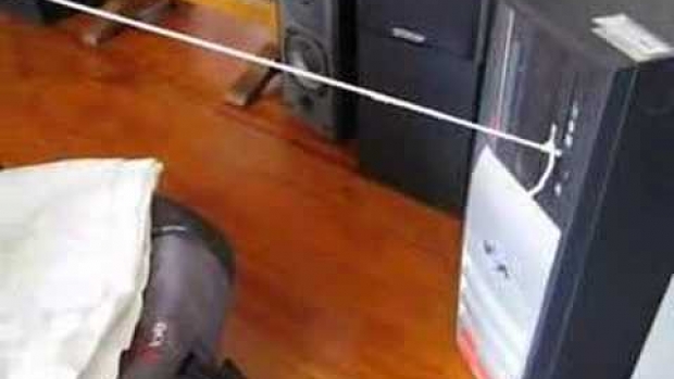 to moze odrazu cos w stylu : Pomysłowy tatuś usypa dziecko przywiązawszy kołyskę do CDromu ktory regularnie sie zamyka i otwiera sznurkiem. Dziecko ma na imie Krzyś a ojciec Grześ. CDrom firmy LG.