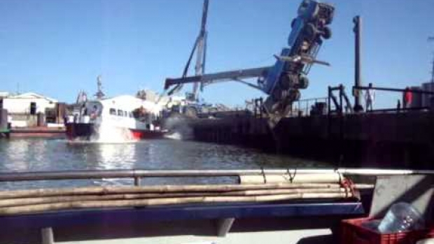 wszerad niekoniecznie, bo mogla sie w statku dziura zrobic i mogl powoli tonac, bo ladnie przypertolil w pomost, a dzwig chyba oparl sie o dno wysiegnikiem, dlatego nie wpadl ;)