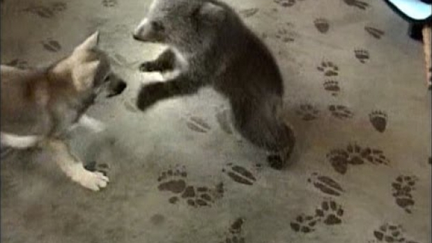 Maxiory > Zwierzęta > Grizzly i wilk bawią się razem