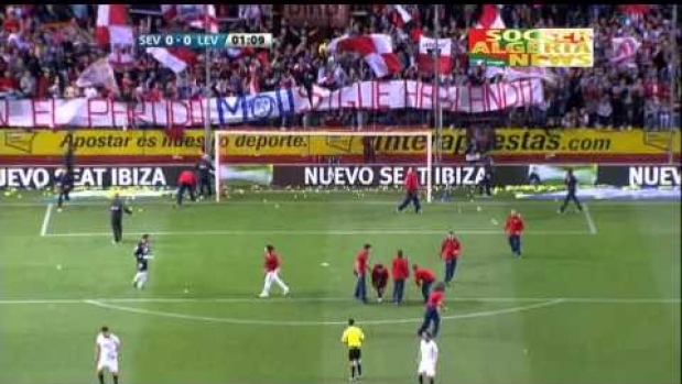 Kibice rzucają piłeczki tenisowe na murawę w Sevilli