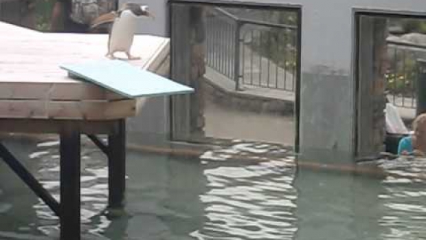 Maxiory > Zwierzęta > Pingwin próbuje skoczyć z trampoliny do wody