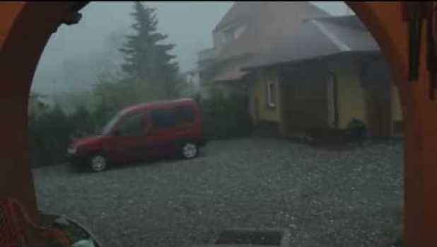 Podczas grillowania zaskoczyła nas matka natura. Grad pierwszy raz w tym regionie od dziesiątek lat osiągnął średnicę niemalże 5 cm, był jak piłki pingpongowe odbijające się od pasa zieleni co widać na filmie. Dźwięk jest stabilny, to nie automatyczna funkcja zwiększania głośności, szum oraz huk uderzających kul był nie do wytrzymania przez dłuższy czas, rozmowa na zewnątrz była niemożliwa. Wiatr osiągał prędkość 100 ,120 km na godzinę , w porywach jeszcze więcej. Czyżby skutki globalnego ocieplenia? Czy też kataklizmy zapowiadające coś więcej , w każdym razie pierwszy raz spotykam się z czymś takim od dawien dawna.