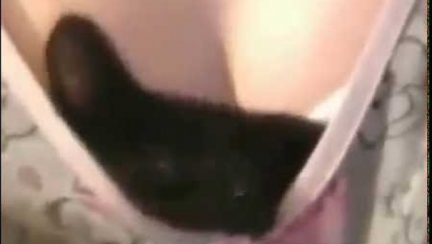 Odważny mały kotek broni swojej pani, będąc ukrytym w bardzo wygodnej "fortecy".