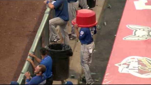 Gość nakłada sobie pokrywkę na śmieci, a potem ona chroni go przed mocnym uderzeniem.