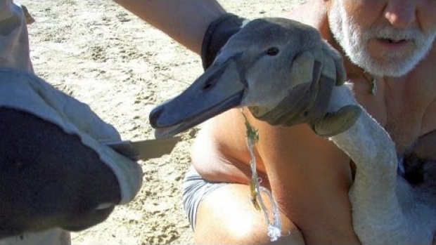 Film pokazuje szybką 'akcję' uwolnienia łabędzia, który paskudnie 'złowił się' na zerwany i pozostawiony w wodzie wędkarski 'sprzęt', który utkwił mu w przełyku. Jak można się przy okazji przekonać - łabędź, nawet młody potrafi się bronić nie tylko dziobem, ale i pazurami łap. Krew się więc polała...
