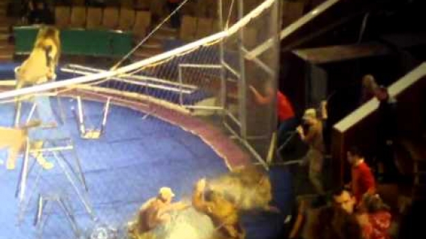 Wyjątkowo podrażnione lwy rzucają się na cyrkowców.