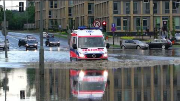 Karetka Pogotowia - Mercedes Sprinter przejeżdża przez wysoką wodę spowodowaną obfitymi deszczami.